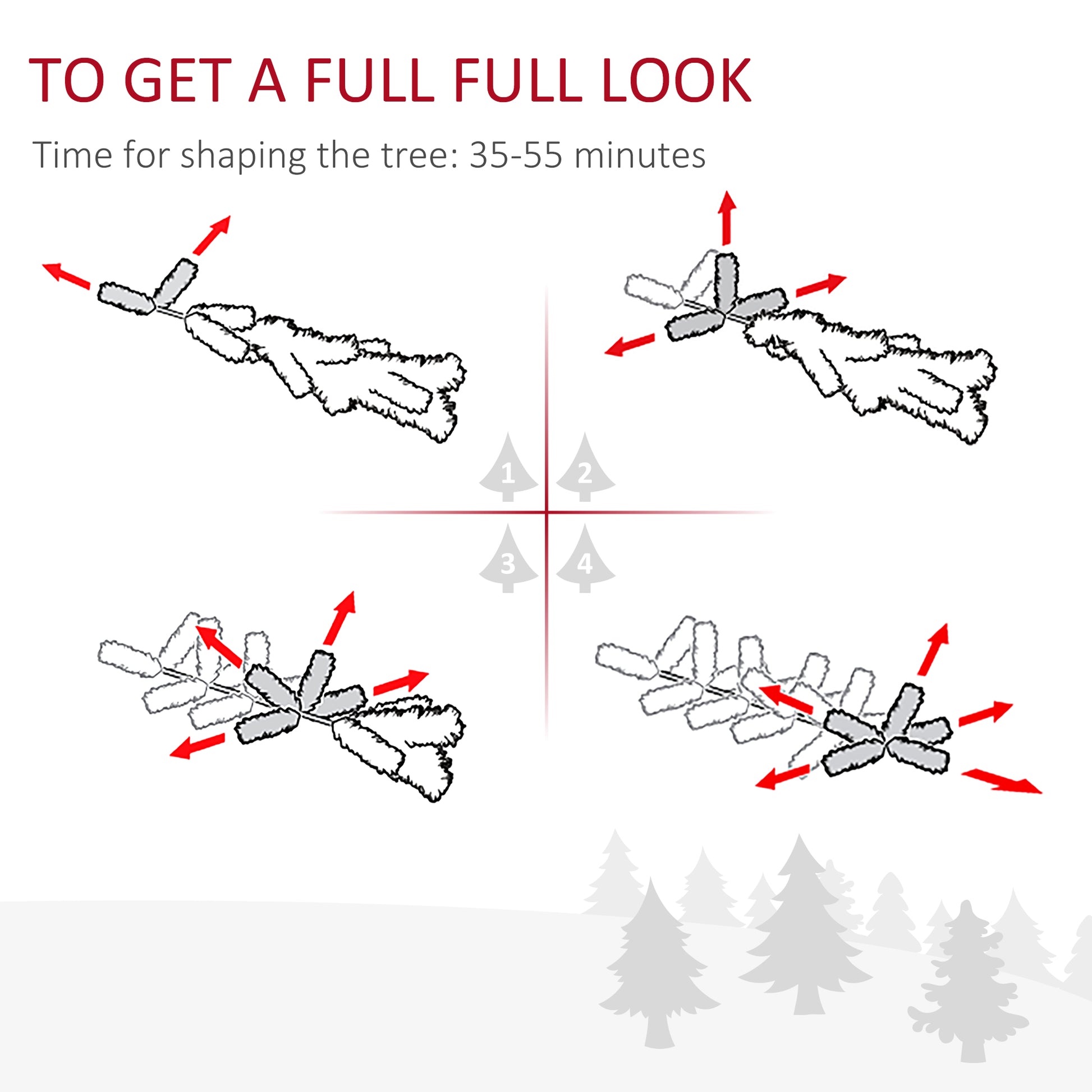 HOMCOM's artificial Christmas tree selection gets you all the ambience the holiday brings without any of the mess the holiday brings. Spending time together with friends and family is really what Christmas is all about, and your tree is something you shouldn't have to mess with (ugh). Our HOMCOM artificial Christmas trees will help take some of the hassle out of the holiday. Little mess, simple assembly, and impeccable ambience help make your season just a little brighter. Features: - 7.5 ft tall artificial Christmas tree with realistic look, berries, pine cones - Snow dipped design, ends are painted white, add winter atmosphere - Warm white 350 LED lighting built right into the tree for a dazzling display - Base is detachable and foldable for easy storage - Solid base for added stability - Branches are flame retardant for added safety Specification: - Color: Green, White - Material: PVC, Steel- Overall Dimensions: 30" D x 90"H - Cord Length: 106.8" - Tip Count: 1075 - Light Count: 350 - Light Modes: LED - Input: 120 V/60 Hz - Output: DC 30 V/6 W - Item Label: 830-380V81 Note: Only for indoor use, not for outdoor In order to get a full appearance, suggest you spend about 35-55 minutes to fluff this tree. Package Includes: - 1 x Christmas Tree - 46 x Pinecone - 50 x Red Berry - 1 x Manual HOMCOM's artificial Christmas tree selection gets you all the ambience the holiday brings without any of the mess the holiday brings. Features: - 9 ft tall artificial Christmas tree with realistic look, berries, pine cones - Snow dipped design, ends are painted white, add winter atmosphere - Warm white 460 LED lighting built right into the tree for a dazzling display - Base is detachable and foldable for easy storage - Solid base for added stability - Branches are flame retardant for added safety Specification: - Color: Green, White - Material: PVC, Steel- Overall Dimensions: 30.75" D x 108"H - Cord Length: 106.8" - Tip Count: 1298 - Light Count: 460 - Light Modes: LED - Input: 120 V/60 Hz - Output: DC 30 V/6 W - Item Label: 830-380V82 Note: Only for indoor use, not for outdoor In order to get a full appearance, suggest you spend about 35-55 minutes to fluff this tree. Package Includes: - 1 x Christmas Tree - 55 x Pinecone - 59 x Red Berry - 1 x Manual HOMCOM's artificial Christmas tree selection gets you all the ambience the holiday brings without any of the mess the holiday brings. Features: - 6 ft tall artificial Christmas tree with realistic look, berries, pine cones - Snow dipped design, ends are painted white, add winter atmosphere - Warm white 300 LED lighting built right into the tree for a dazzling display - Base is detachable and foldable for easy storage - Solid base for added stability - Branches are flame retardant for added safety Specification: - Color: Green, White - Material: PVC, Steel- Overall Dimensions: 25.5" D x 72"H - Cord Length: 106.8" - Tip Count: 618 - Light Count: 300 - Light Modes: LED - Input: 120 V/60 Hz - Output: DC 30 V/6 W - Item Label: 830-380V80 Note: Only for indoor use, not for outdoor In order to get a full appearance, suggest you spend about 20-30 minutes to fluff this tree. Package Includes: - 1 x Christmas Tree - 30 x Pinecone - 34 x Red Berry - 1 x Manual.